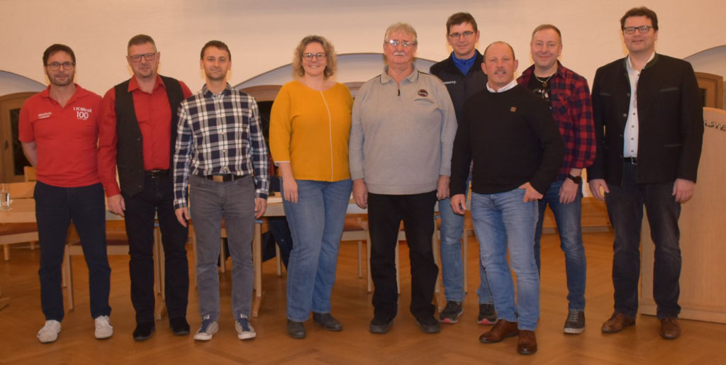 Wilfried Hörmann (Kassenprüfer), Thomas Steindl (2. Vorsitzender, überfachlicher Jugendleiter), Manfred Leopold (3. Vorsitzender), Mario Höcherl (Kassenprüfer), 1. Bürgermeister Dr. Stefan Spindler